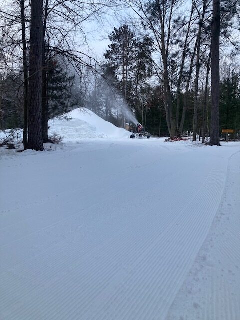 Thanks to the valiant efforts of our snow making and grooming teams, the trails are in much better shape today! We moved a bunch of snow around at the trailhead and throughout some of the main network and the corduroy is looking and feeling good! Skiers yesterday reported fun conditions even with the little glaze. We were able to chew up Trappers cabin, Adventure,
