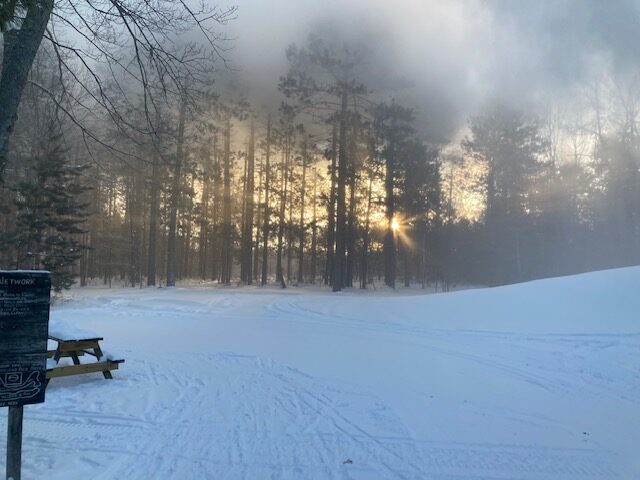 Currently -14F. Albeit bone-chillingly cold, the sunrise through the morning forest is stunning. There is something almost magical when temps get this cold. Everything is completely still and silent, and there is a real beauty in that. That being said, if you plan to come ski and participate in the festivities today, please dress appropriately! Lots of layers, skin protection, hand and toe warmers,