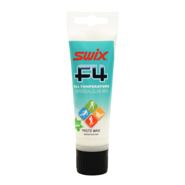 Swix F4 Paste Glidewax Universal All Temperature Paste wax for skis. All snow conditions. Handy pocket size. Apply, polish and go! Special tip: Use Fast Wax Combi Brush. Polish with the felt and then brush lightly.